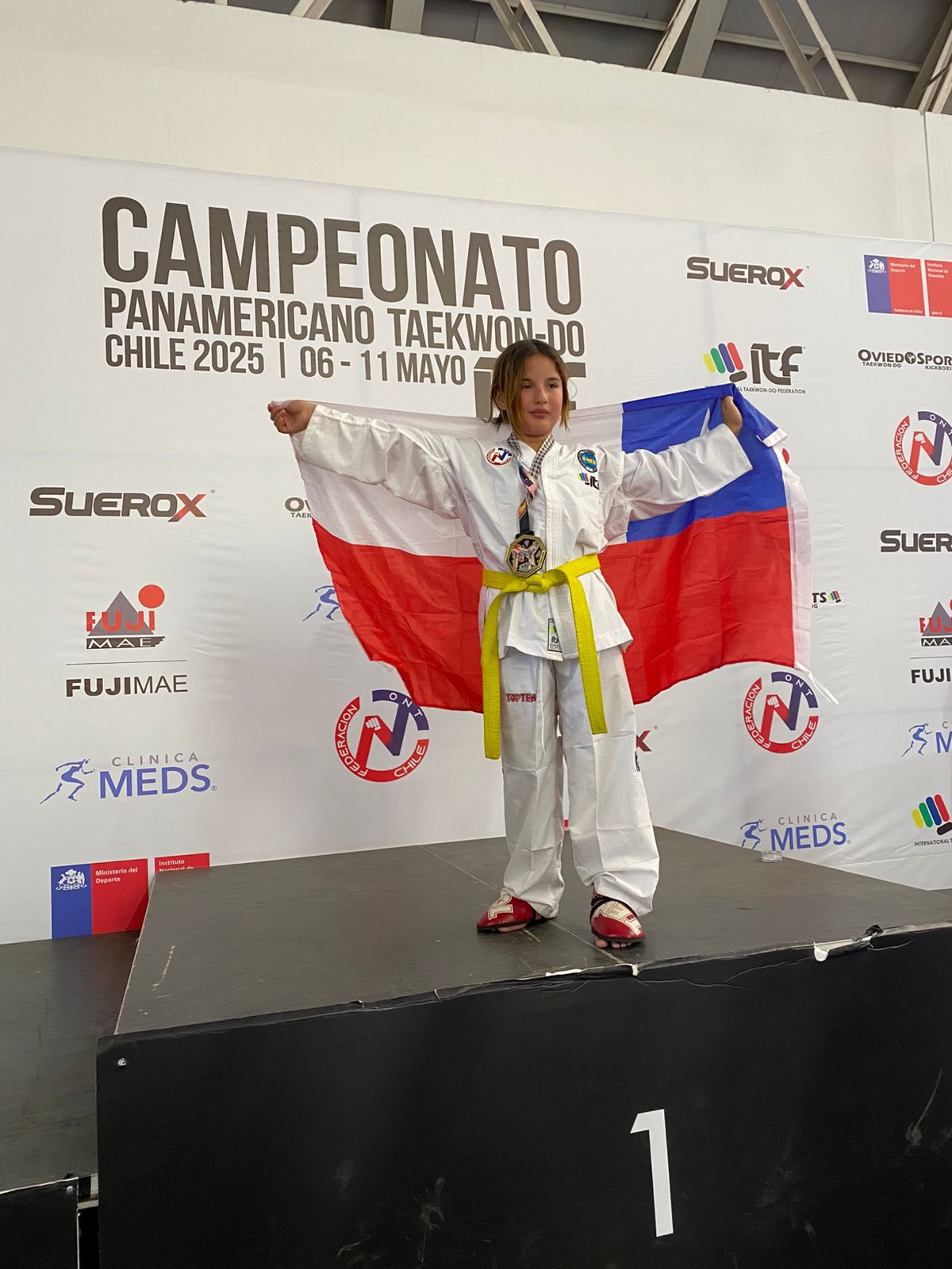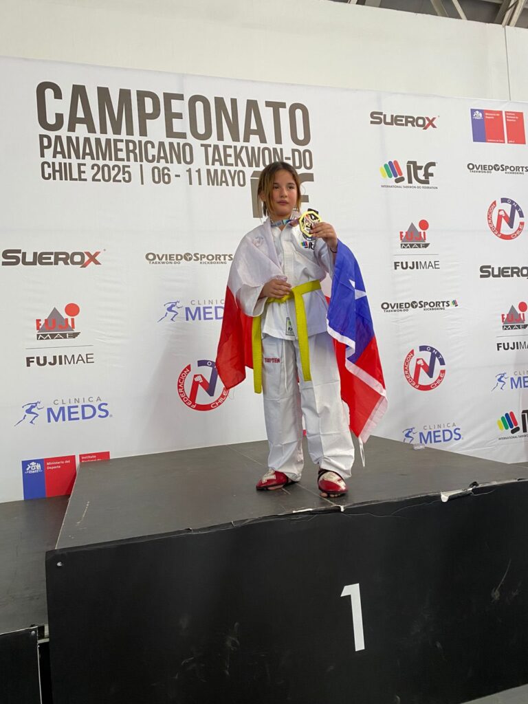 Felicitamos con enorme alegría a nuestra estudiante Danae Olivares de 6° Básico, quien acaba de obtener el primer lugar femenino en la categoría infantil en el Campeonato Panamericano de Taekwon-Do ITF, que se está llevando a cabo en el Polideportivo del Estadio Nacional.