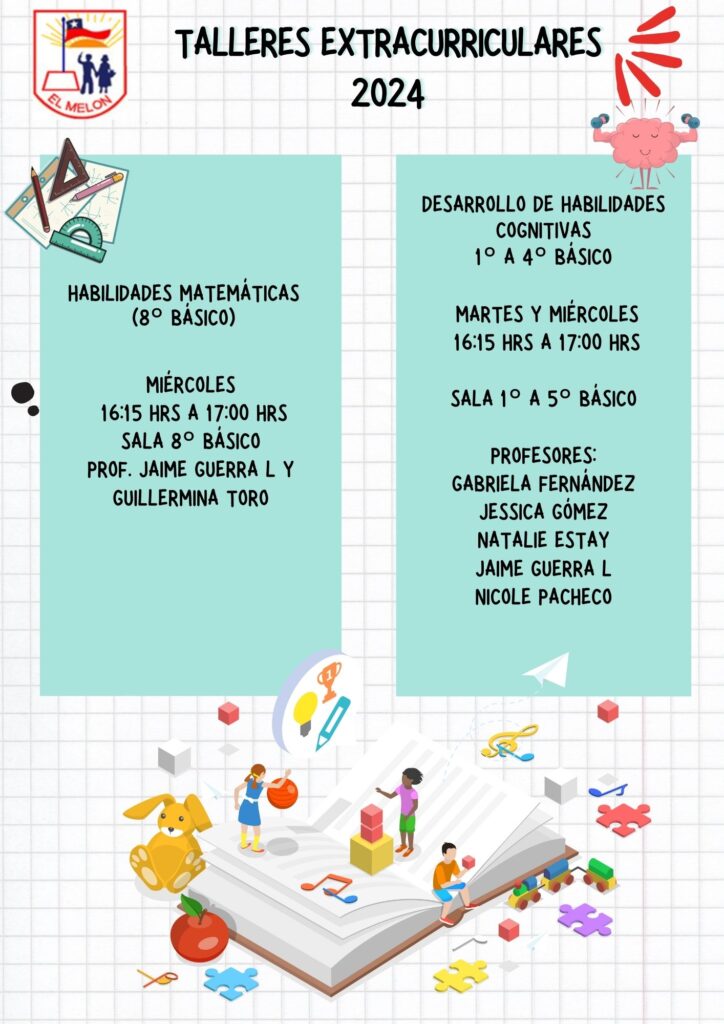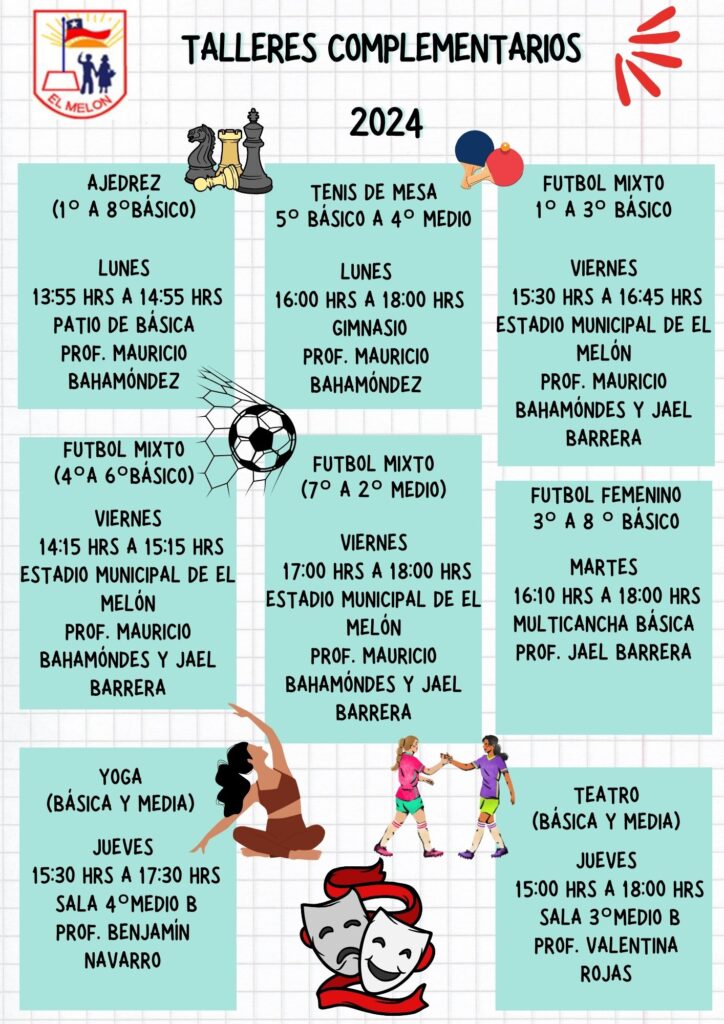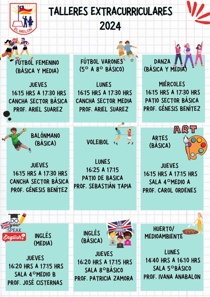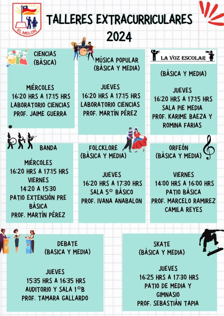 Comunicamos a nuestra Comunidad Educativa los talleres extracurriculares y complementarios que imparte nuestro establecimiento este año 2024, todo esto gracias a la gestión y espacios que brindan nuestra Alcaldesa Margarita Osorio. Recuerda que puedes acercarte al encargado de los talleres profesor Jonathan Saavedra ante cualquier duda. Los esperamos.